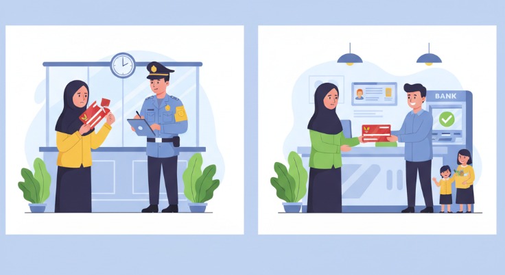 Ilustrasi proses mengurus Kartu KKS yang hilang: seorang wanita melapor ke polisi, lalu menerima kartu baru dari petugas bank.